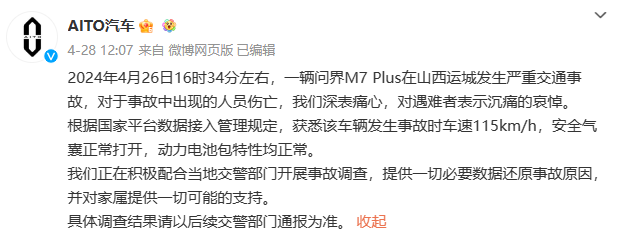 4月28日,问界声明称,该车辆发生事故时车速115km/h,安全气囊正常打开,动力电池包特性均正常。目前,事故原因有待有关方面进一步调查。