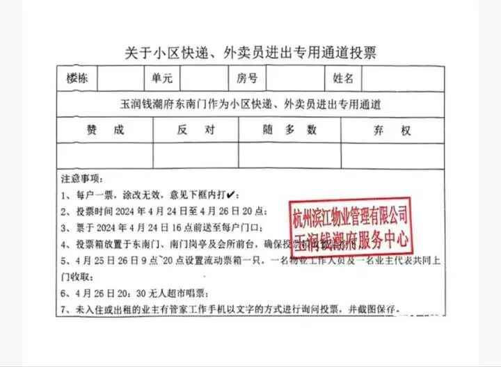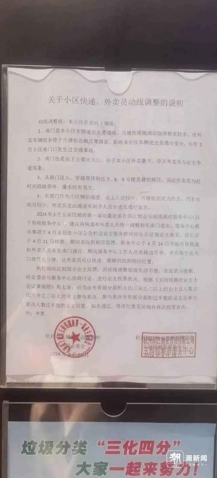 出于保障安全和有序管理层面的考虑,4月4日,滨江物业玉润钱潮府服务中心在玉润钱潮府第一届业委会的建议下,在小区内张贴了一纸告示,表明将把东南门调整为快递和外卖人员唯一进出通道,公示期为4月5日至4月11日,期间若无业主有异议,此办法将在4月14日起正式实行。