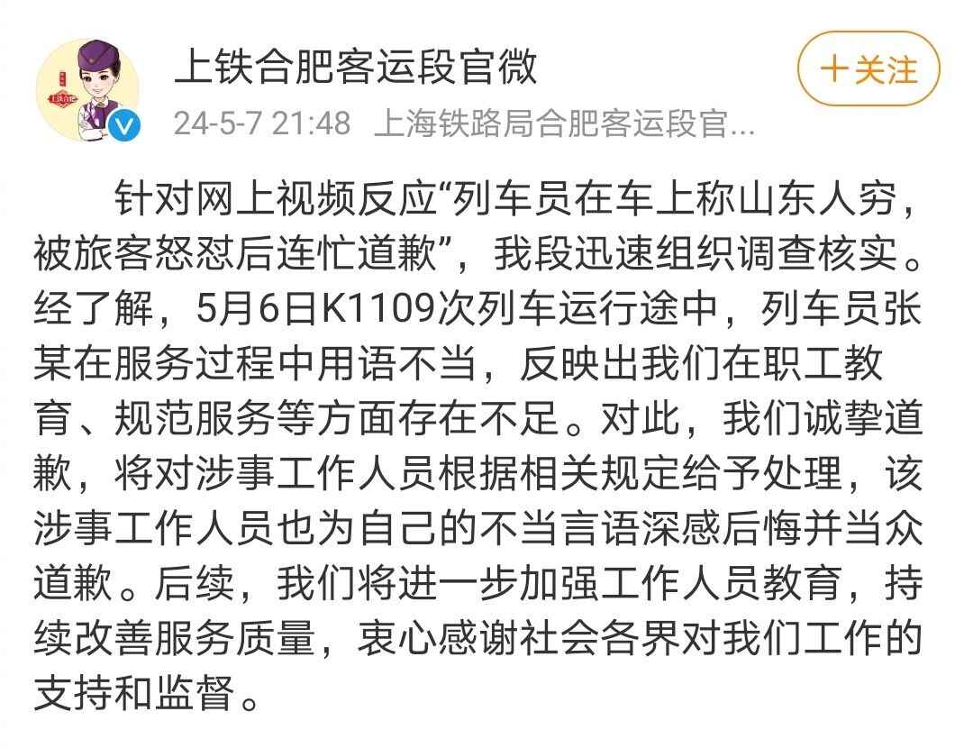5月7日晚,针对网上视频反映“列车员在车上称山东人穷,被旅客怒怼后连忙道歉”情况,上海铁路局合肥客运段官方微博发布通报称,客运段诚挚道歉,将对涉事工作人员根据相关规定给予处理,该涉事工作人员也为自己的不当言语深感后悔并当众道歉。