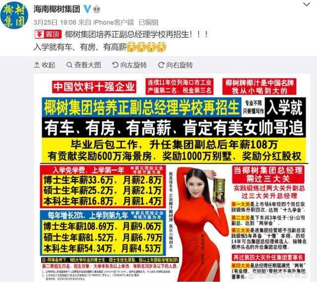 2021年3月,椰树集团的招聘广告中,除了可以看到“中国饮料十强企业”“连续11年位列海口市工业产值第二名、税金第三名”“ 椰树牌椰汁是中国名牌”等这类常规介绍外,还能看到“入学就有车、有房、有高薪、肯定有美女帅哥追”“毕业后包工作,升任集团副总后年薪108万”“有贡献奖励600万海景房,奖励1000万别墅,奖励分红股权”等极具噱头的宣传。