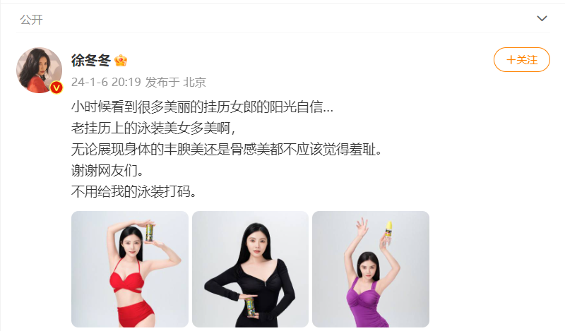 1月6日晚,演员徐冬冬在社交媒体发文回应“椰树泳装挂历争议”:“小时候看到很多美丽的挂历女郎的阳光自信……老挂历上的泳装美女多美啊,无论展现身体的丰腴美还是骨感美都不应该觉得羞耻。谢谢网友们。不用给我的泳装打码。 ”