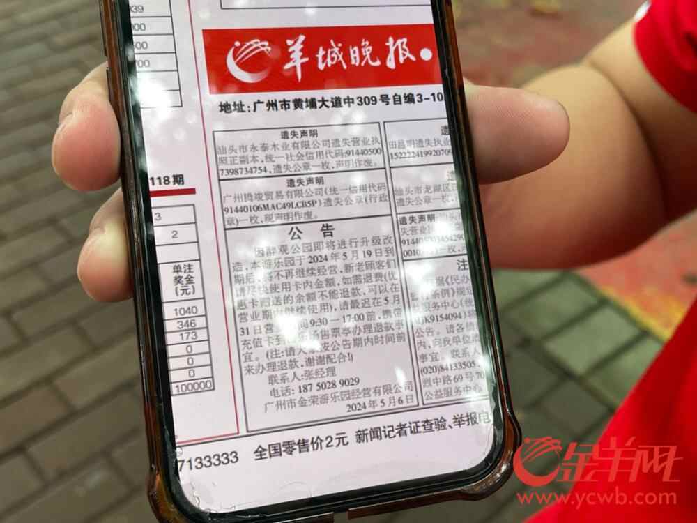 此外,林经理还向记者展示了公司在2024年5月8日《羊城晚报》刊登的结业公告,“在结业前,我们提前在报纸登了公告,希望能提醒市民尽快使用卡内余额或办理退款事宜,以免后续有纠纷。”