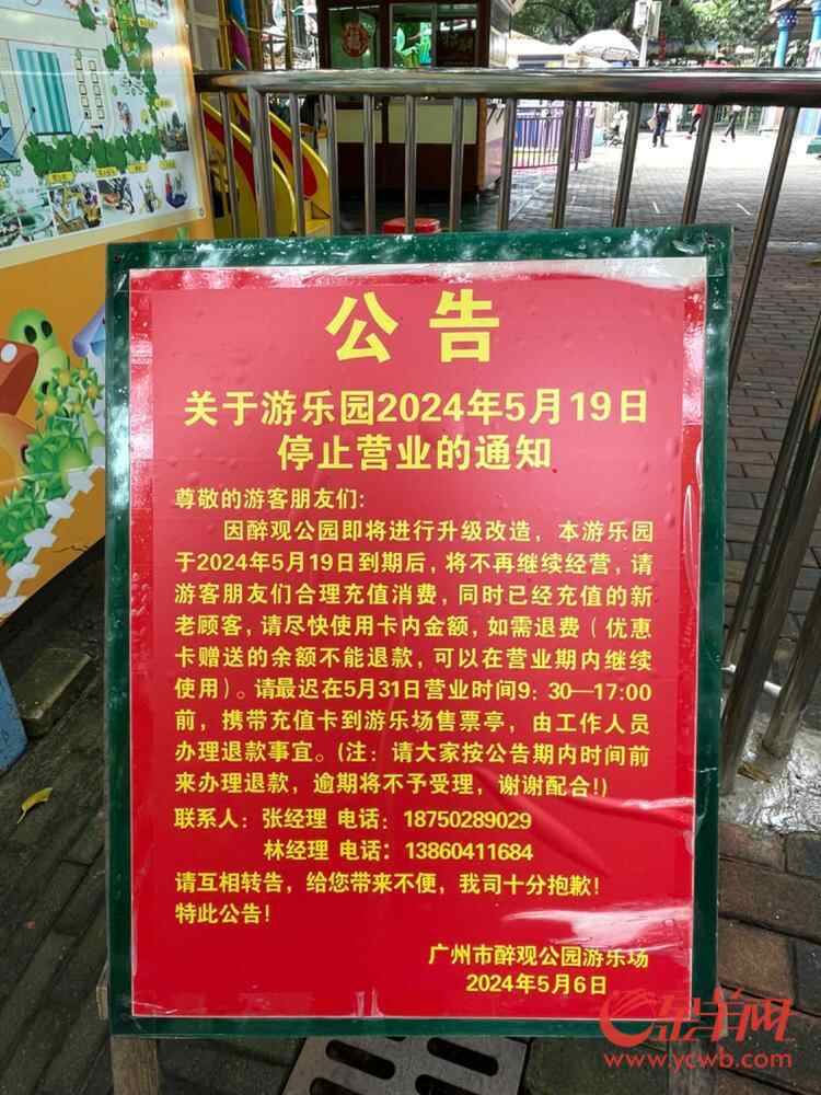 通知提到,因醉观公园即将进行升级改造,本游乐园于2024年5月19日到期后,将不再继续经营。请游客朋友们合理充值消费,同时已经充值的新老顾客,请尽快使用卡内金额,如需退费(优惠卡赠送的余额不能退款,可以在营业期内继续使用),请最迟在5月31日营业时间9:30-17:00前,携带充值卡到游乐场售票亭,由工作人员办理退款事宜。