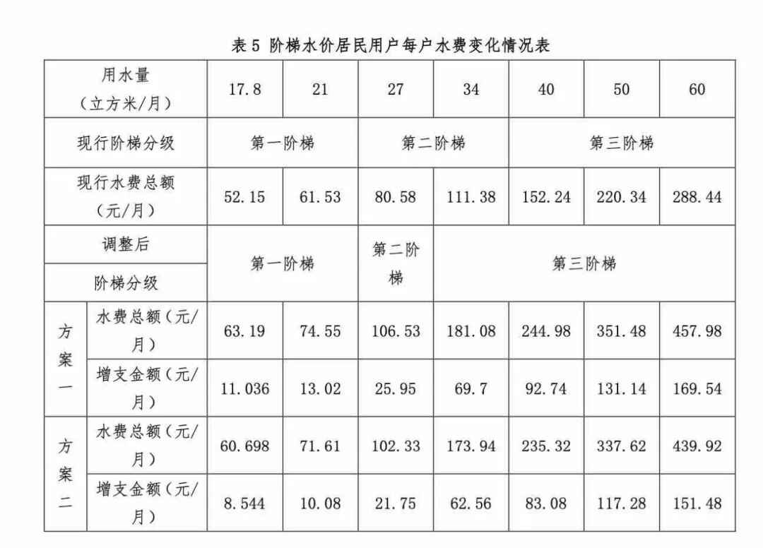 方案二内容为:居民生活用水三个阶梯水价分别为2.46元/立方米、3.69元/立方米、7.38元/立方米;居民合表水价为2.71元/立方米;非居民生活用水价格调整为4.81元/立方米,特种用水价格调整为25元/立方米。