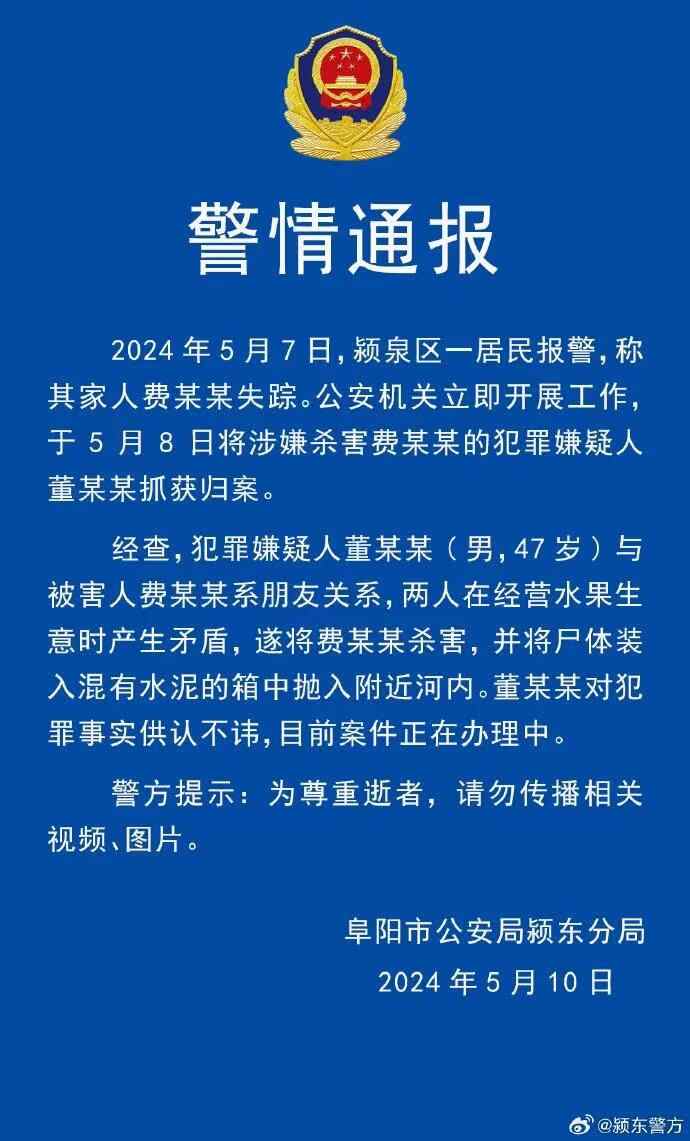 2024年5月7日,颍泉区一居民报警,称其家人费某某失踪。公安机关立即开展工作,于5月8日将涉嫌杀害费某某的犯罪嫌疑人董某某抓获归案。