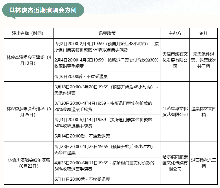 而天津4月13日的演唱会则不存在无条件退票规则,退票按时间段分为门票价格3%、门票价格30%以及不支持退票三个梯次进行划分。