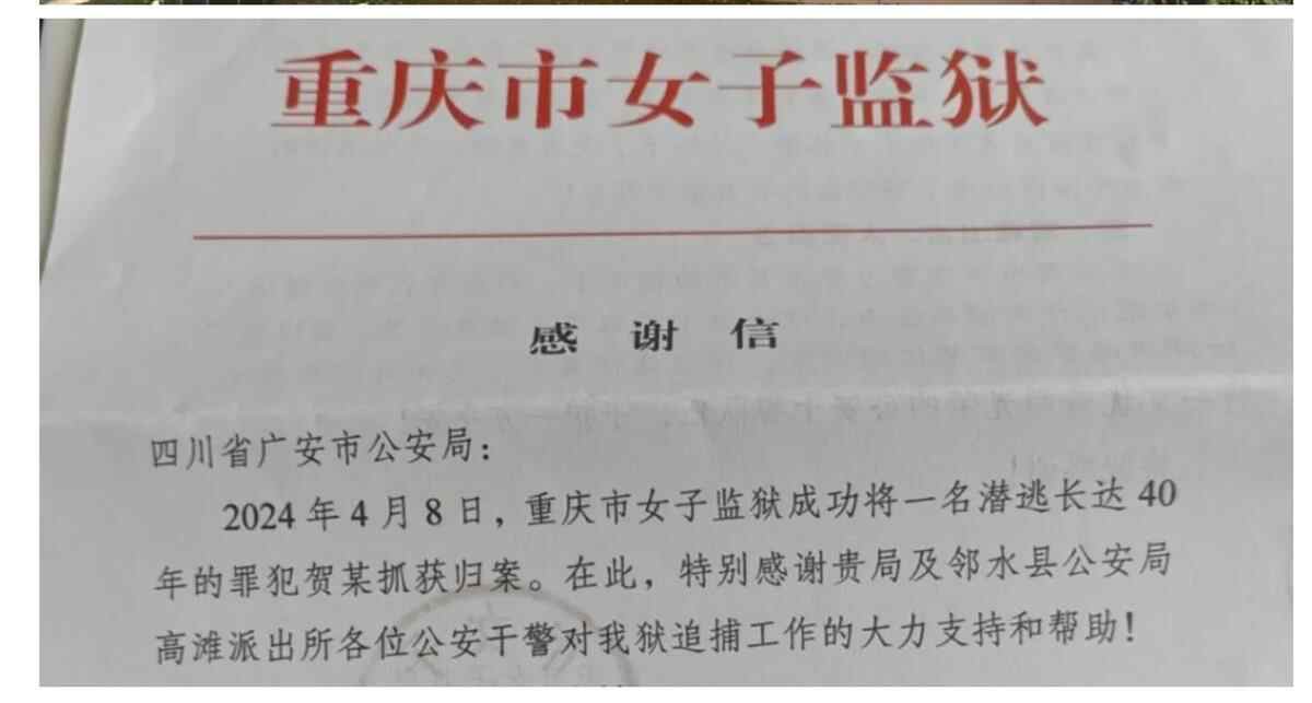 据四川邻水县公安局官方公众号,2024年春节前,邻水县公安局高滩派出所收到重庆市女子监狱寄来的协查通报,请求协助摸排40年前从重庆市女子监狱逃脱的诈骗罪服刑人员贺某。高滩派出所摸排核查,准确掌握贺某现在在重庆某地居住生活的重要线索,并在重庆市渝北区发现贺某活动轨迹和准确住址,及时将该条线索通报重庆市女子监狱。2024年4月8日,重庆市女子监狱在重庆将逃犯贺某抓获。