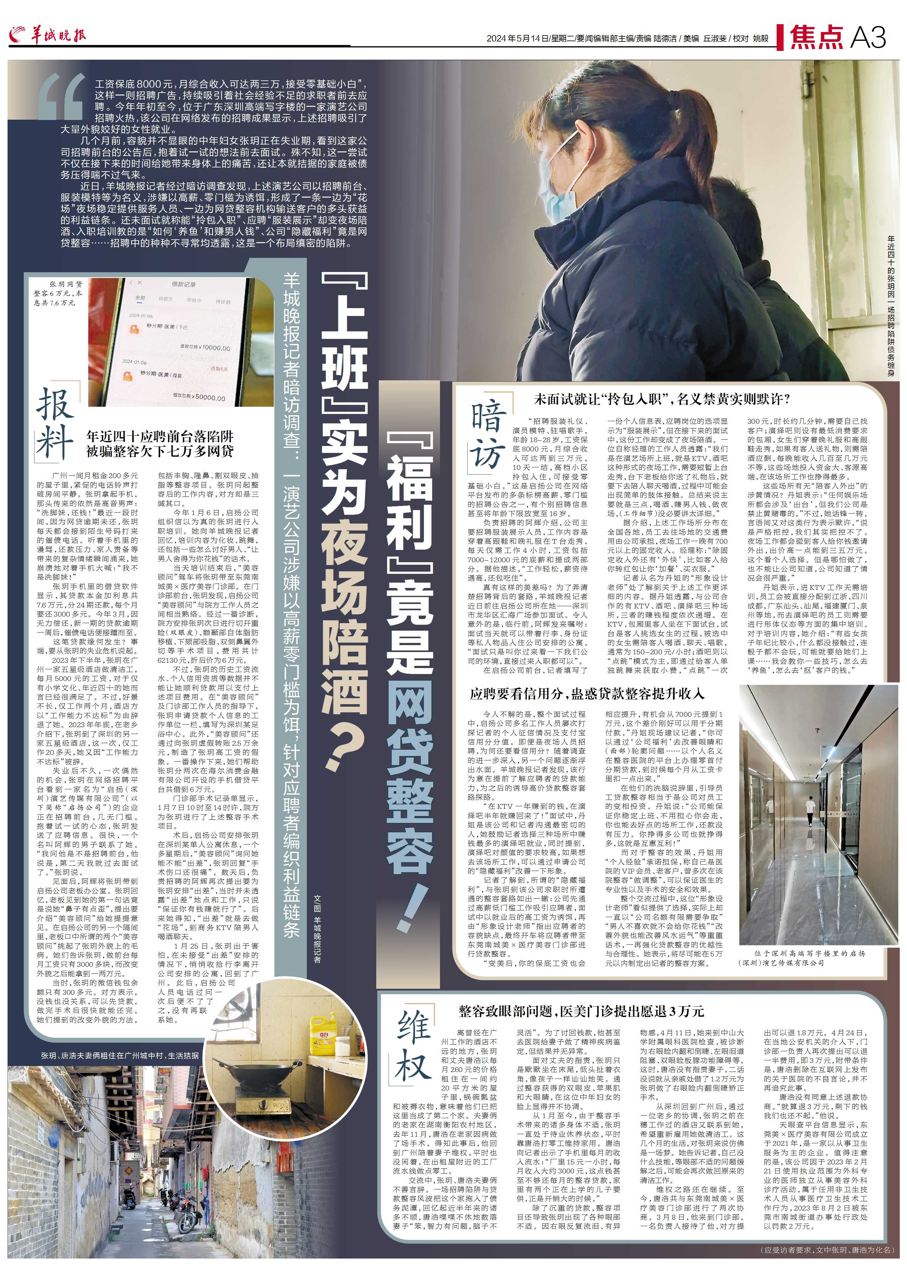 近日,羊城晚报记者经过暗访调查发现,上述演艺公司以招聘前台、服装模特等为名义,涉嫌以高薪、零门槛为诱饵,形成了一条一边为“花场”夜场稳定提供服务人员、一边为网贷整容机构输送客户的多头获益的利益链条。还未面试就称能“拎包入职”、应聘“服装展示”却变夜场陪酒、入职培训教的是“如何‘养鱼’和赚男人钱”、公司“隐藏福利”竟是网贷整容……招聘中的种种不寻常均透露,这是一个布局缜密的陷阱。