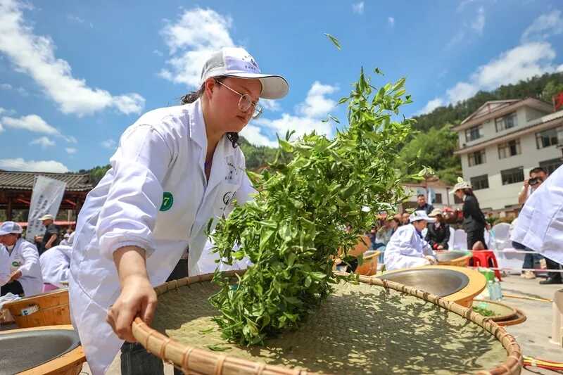 4月19日,2024年贵州省“太极古茶杯”第七届古树茶加工技能大赛在毕节市七星关区亮岩镇太极村举行。来自贵州各地13个代表队上百名选手同台切磋技艺,传承茶叶传统加工工艺,打造古树茶加工交流学习平台,进一步助推全省茶产业高质量发展。图为2024年4月19日,参赛选手参加绿茶加工项目比赛。人民图片陈曦/摄