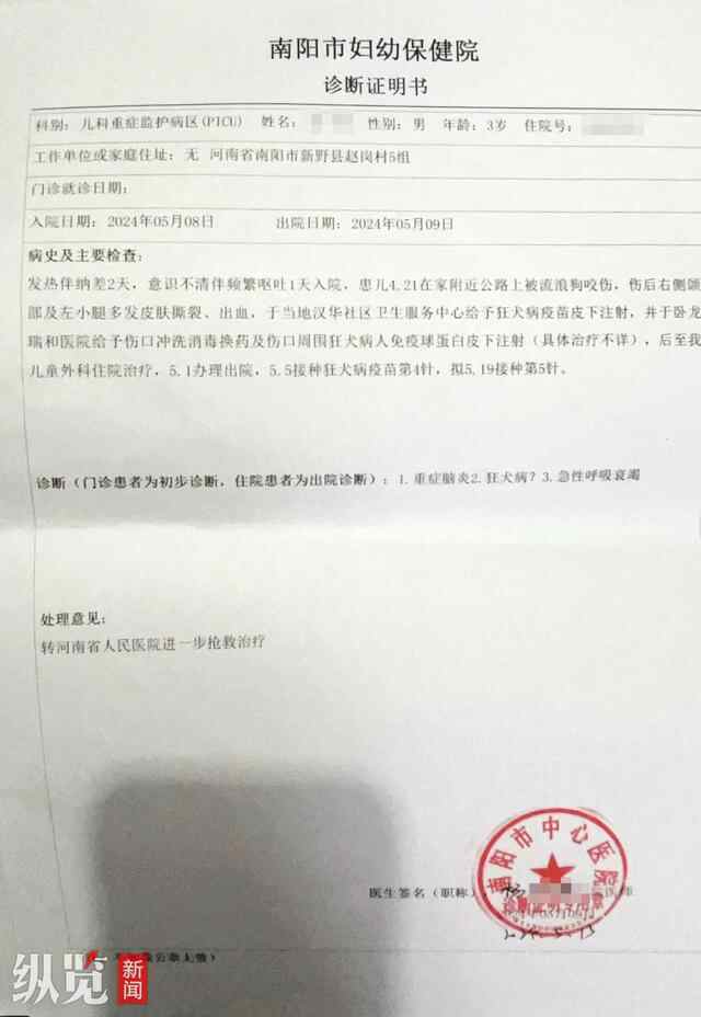 纵览新闻记者在樊女士提供的诊断证明书看到,南阳市中心医院·南阳市妇幼保健院为小星做出的诊断为:1、重症脑炎 2、狂犬病 3、急性呼吸衰竭。但第二项狂犬病处标有一问号。5月14日,纵览新闻记者拨打了南阳市中心医院的电话,工作人员称,病情属于个人隐私,不方便透露。