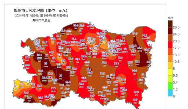 15日,大象新闻记者从郑州市气象台获悉,受冷空气影响,2024年05月14日20时至05月15日05时,郑州市出现大风天气,其中阵风9—10级,局地阵风达11级。郑州全市有131个自动站极大风速达到7级以上,极大风速出现在巩义市的山川站38.1米/秒(13级)。