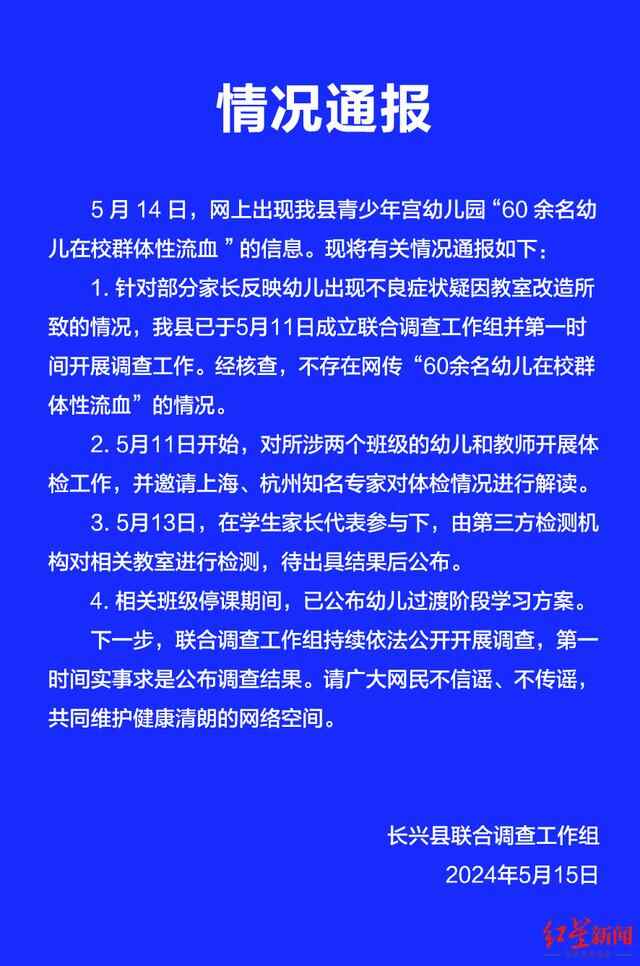 1、针对部分家长反映幼儿出现不良症状疑因教室改造所致的情况,我县已于5月11日成立联合调查工作组并第一时间开展调查工作。经核查,不存在网传“60余名幼儿在校群体性流血”的情况。