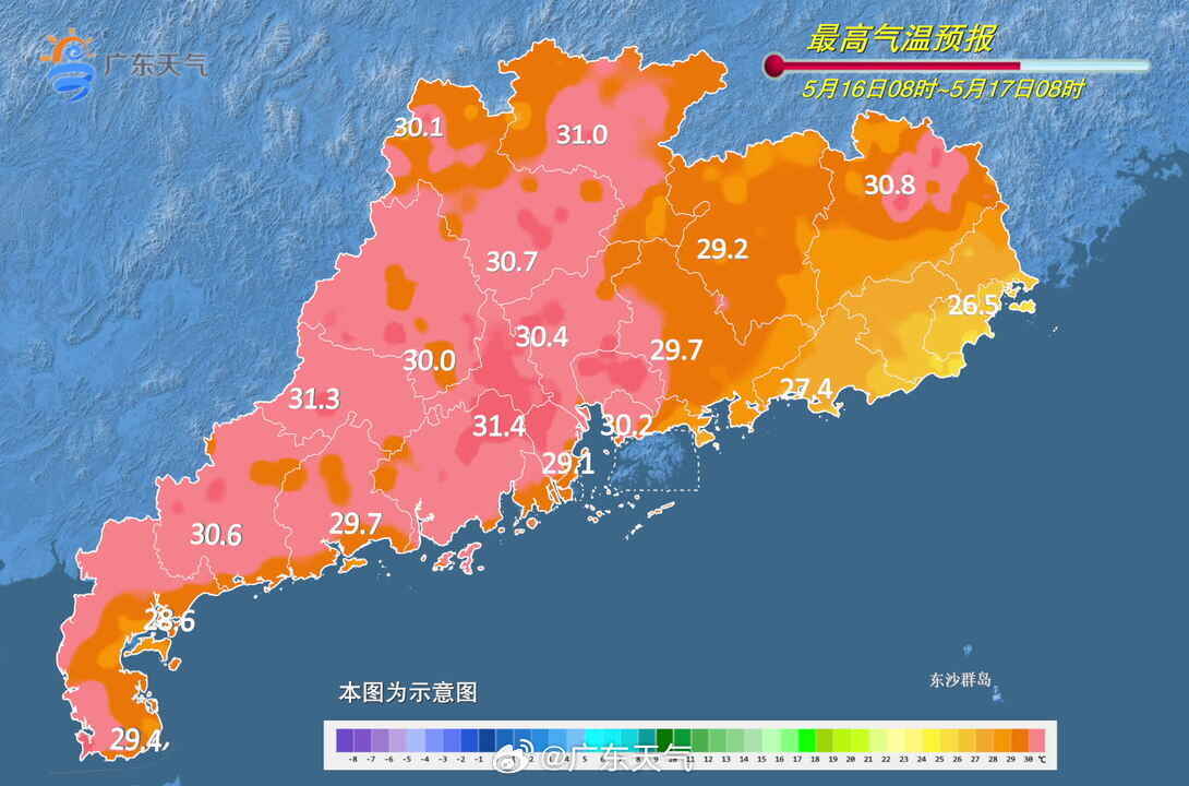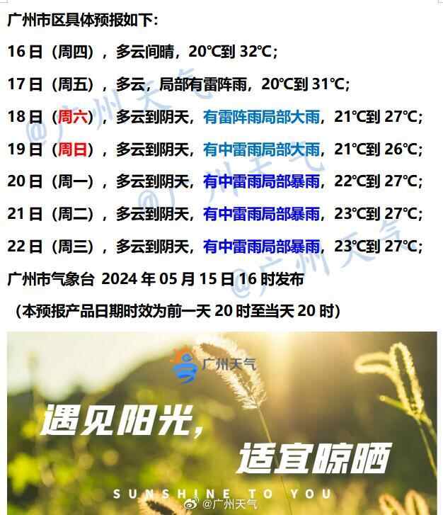 广州气象台预计,16日,广州晴到多云为主,17日云量增多,局部有雷阵雨;18日起雷雨天气又趋活跃。
