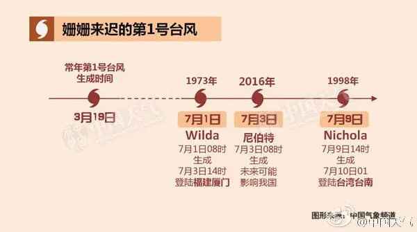 我国有气象记录以来,1号台风生成最晚纪录为1998年7月9日生成的“妮蔻儿”;其次则是2016年7月3日生成的“尼伯特”。