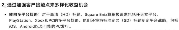SE表示,日后旗下主力IP和3A级游戏将会以多平台发布为目标,积极向NS、PS、Xbox 和 PC平台寻求合作,打造适合更多用户的游戏环境。这对于玩家来说,不失为一个好消息。