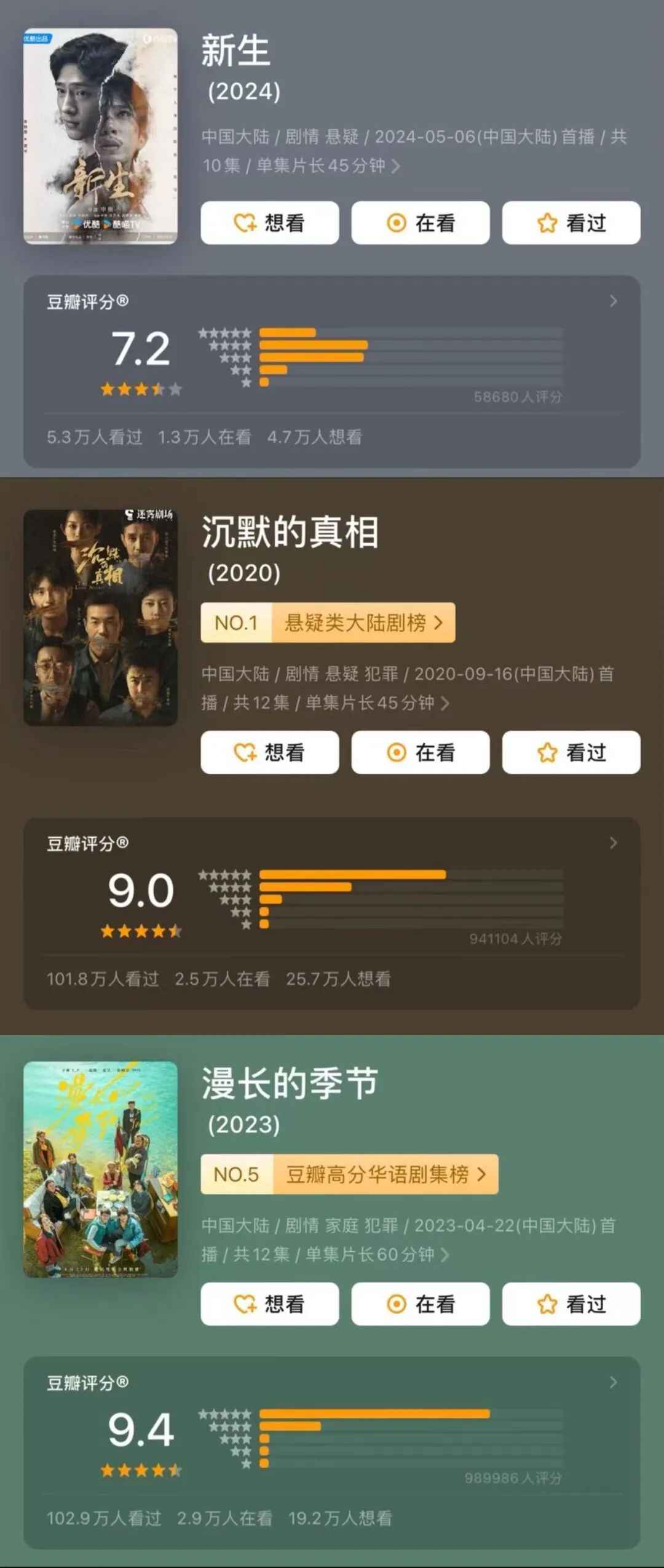 目前,《新生》在评分网站上有5.8万人评分,评分为7.2分,相比于《沉默的真相》《漫长的季节》等9分高分悬疑剧来说,尚有较大差距。