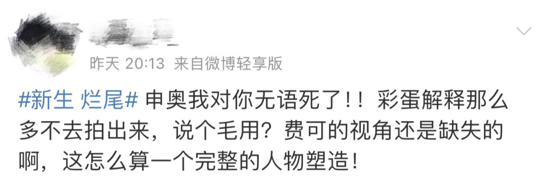 由于结局将视角聚焦在女主,有观众认为男主视角缺失,人物塑造不完整。