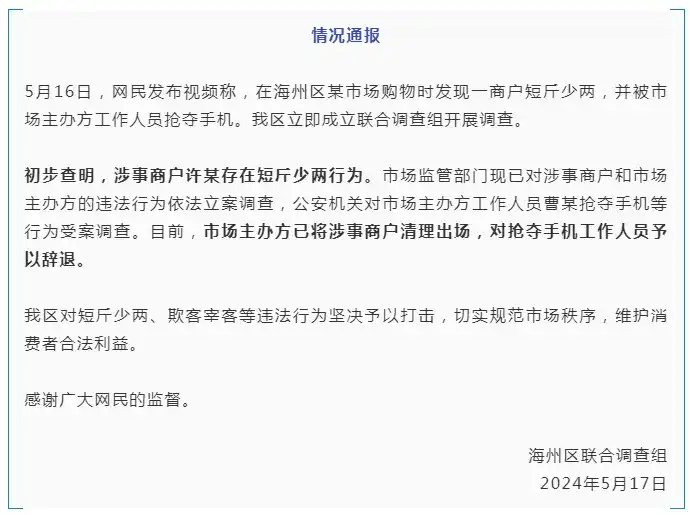 初步查明,涉事商户许某存在短斤少两行为。市场监管部门现已对涉事商户和市场主办方的违法行为依法立案调查,公安机关对市场主办方工作人员曹某抢夺手机等行为受案调查。目前,市场主办方已将涉事商户清理出场,对抢夺手机工作人员予以辞退。