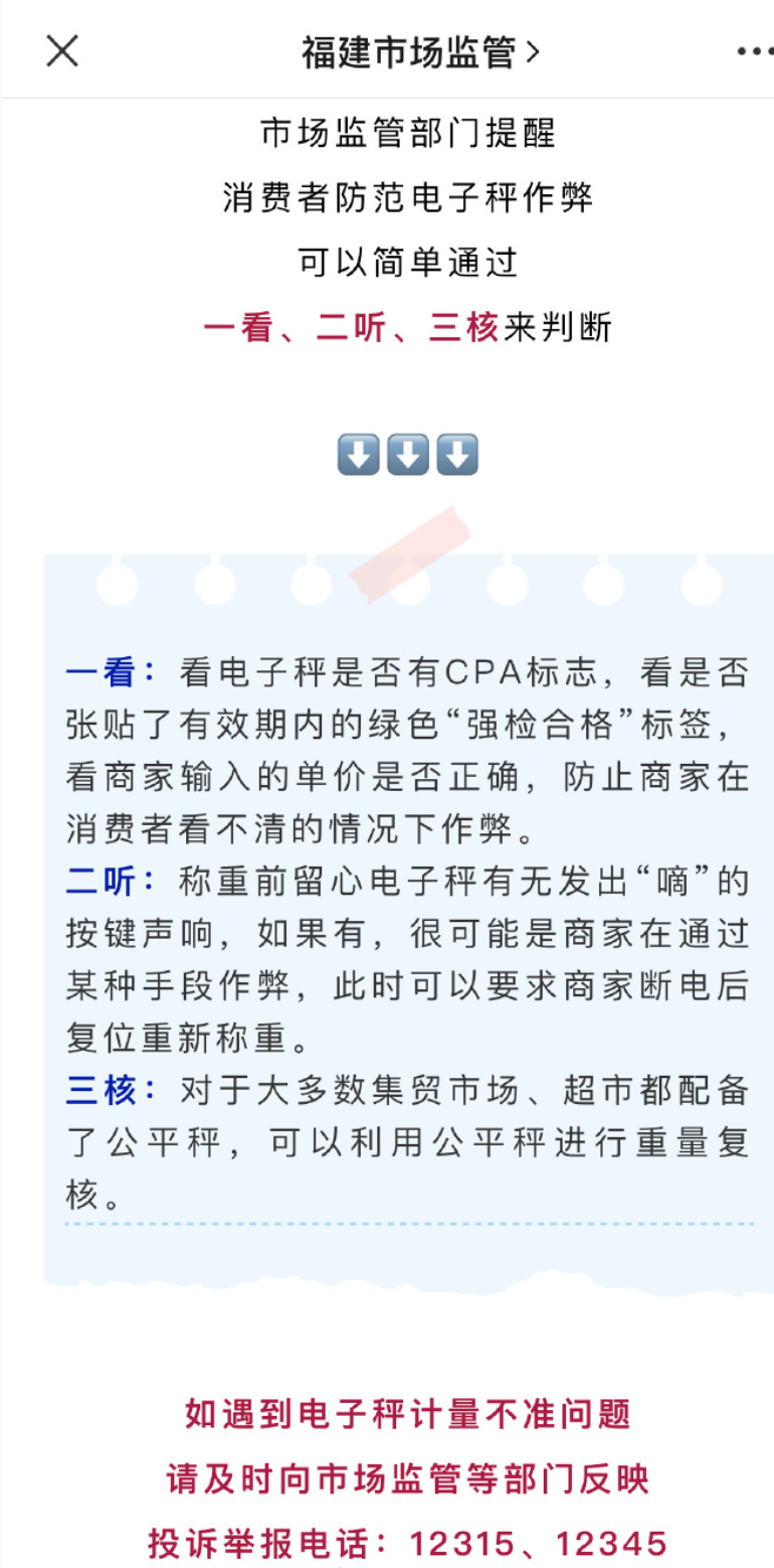 有市场监管部门提醒:消费者防范电子秤作弊,可以简单通过一看、二听、三核来判断。