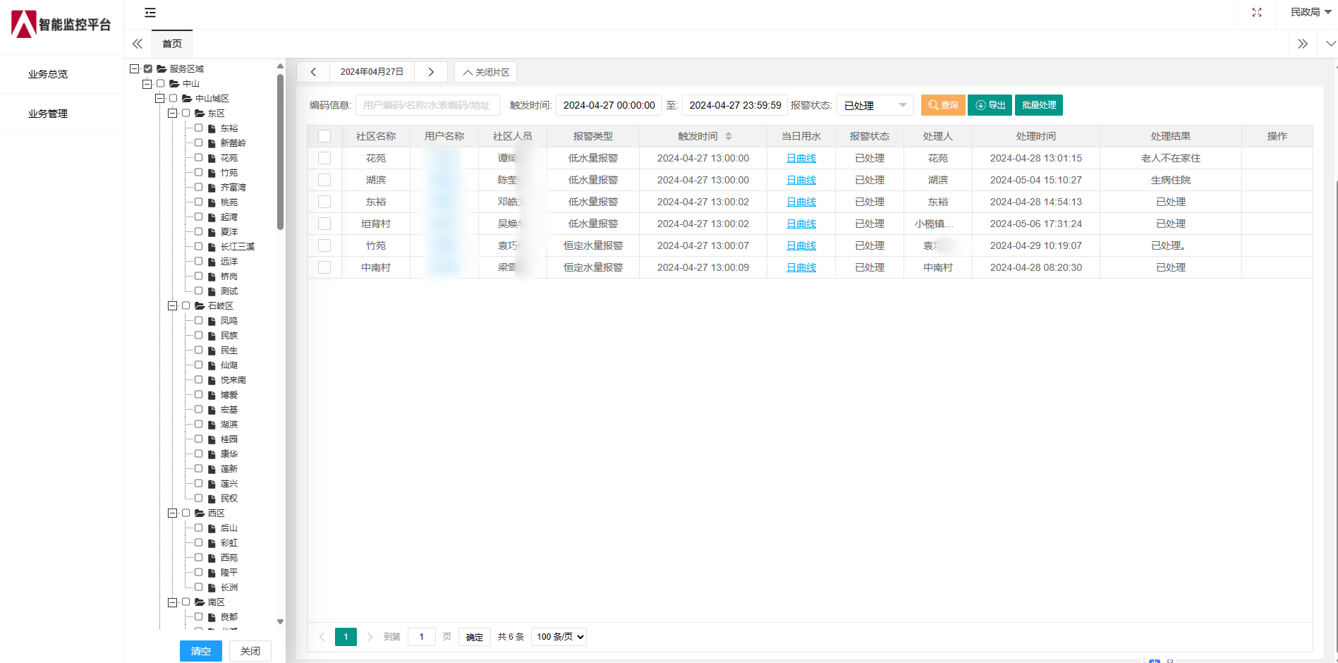 中山市积极推进特殊困难对象免费安装智能水表工作,对民政兜底保障对象中的独居老人、独居重度残疾人、独居重病患者、散居特困人员等特殊困难对象日常用水变化情况进行实时监测和预警;并将异常情况即时推送给监护人及社区联系人手机,确保在接收预警信息后及时核实处置。