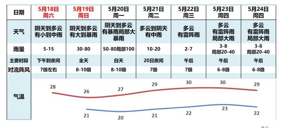 根据研判,季风爆发后,广州市降水具有局地雨强大的特点,甚至有超过4月雨强的可能性,19-20日暴雨最大小时雨强可达80毫米左右。需重点关注强降雨落区与前期灾害高风险区的叠加,加强地质灾害和城市内涝防御工作。