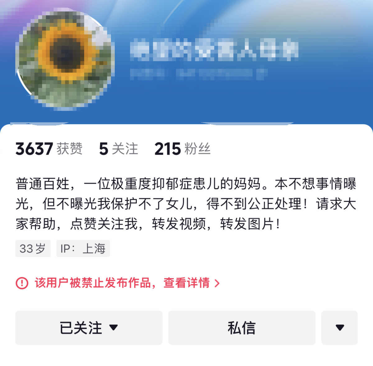 5月15日上午,上述网友的社交媒体账号已被禁止发布作品。