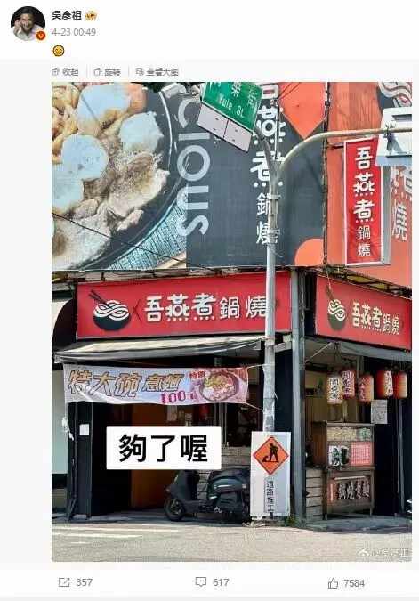 前不久,演员吴彦祖在微博上转发了一张照片,图中是一家名为“吾燕煮”的台湾餐厅,配文“够了喔”。