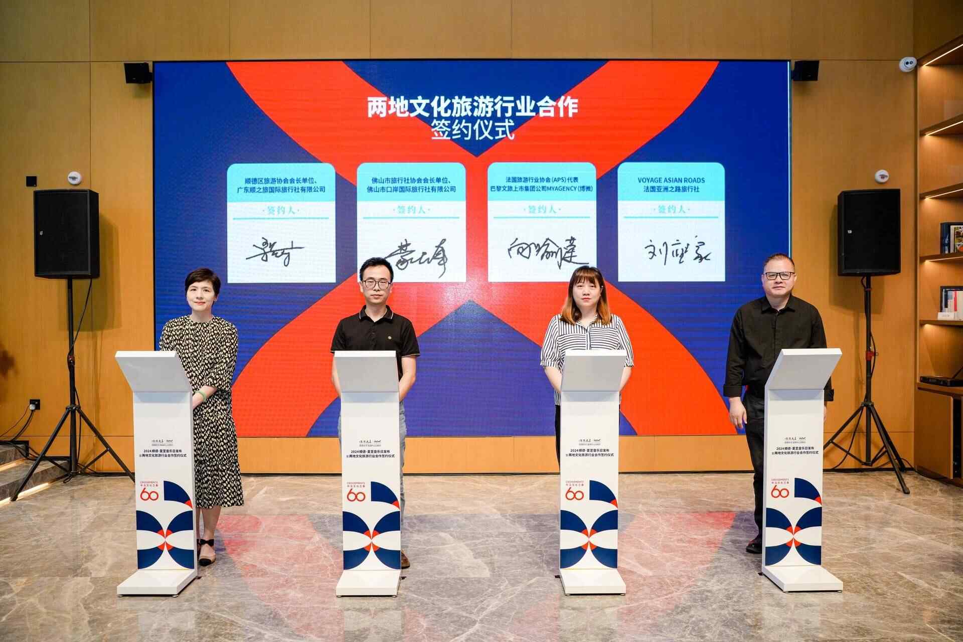2024年是中法建交60周年及法中文化旅游年。当天,中国顺德大良与法国文化旅游行业举行文旅交流签约仪式,双方同意在旅游资源开发、旅游及文化产品建设、旅游市场营销等方面进行全方位合作。中方代表佛山市口岸国际旅行社、广东顺之旅国际旅行社与法国旅游行业协会(APS)代表巴黎文旅上市集团公司MYAGENCY(博微)、VOYAGE ASIAN ROADS法国亚洲之路旅行社正式签约。