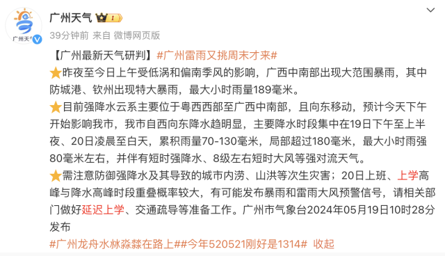 据广州市气象台观测,目前强降水云系主要位于粤西西部至广西中南部,且向东移动,预计19日下午开始影响广州,广州自西向东降水趋于明显,主要降水时段集中在19日下午至上半夜、20日凌晨至白天,累积雨量70-130毫米,局部超过180毫米,最大小时雨强80毫米左右,并伴有短时强降水、8级左右短时大风等强对流天气。