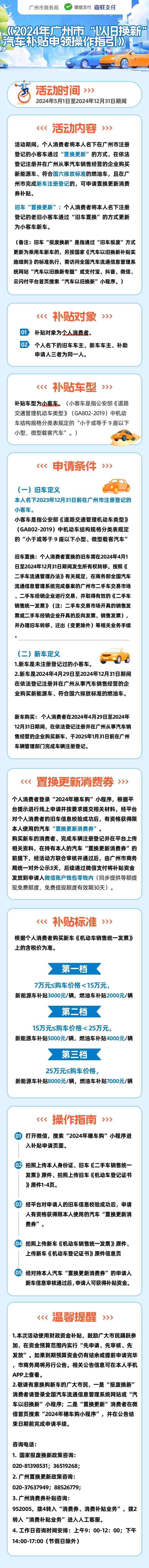 5月20日,羊城晚报记者从广州市商务局了解到,为贯彻落实国家推动大规模设备更新和消费品以旧换新等文件精神,紧抓国家鼓励推进消费品以旧换新决策机遇,鼓励消费者将老旧汽车通过报废和置换方式更新为新车,促进广州市汽车梯次消费、更新消费,推动汽车产业的绿色化、智能化发展,现结合广州市汽车消费工作实际,于5月1日起全面推动开展新一轮汽车以旧换新促进汽车更新消费活动,快来看下申报指南吧!