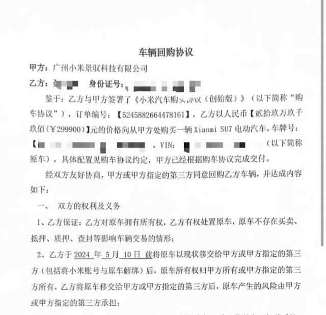 聂先生提供的车辆回购协议显示,经双方友好协商,广州小米景驭科技有限公司同意回购聂先生的车辆,并约定在5月10日前移交,聂先生需配合回购工作并办理相关手续。