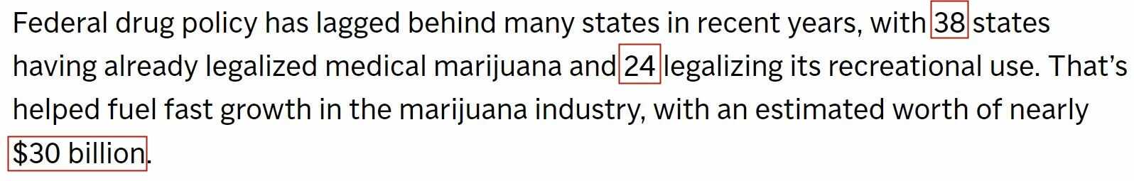 这推动了大麻产业在美国的快速发展,估计其商业及市场价值近300亿美元。