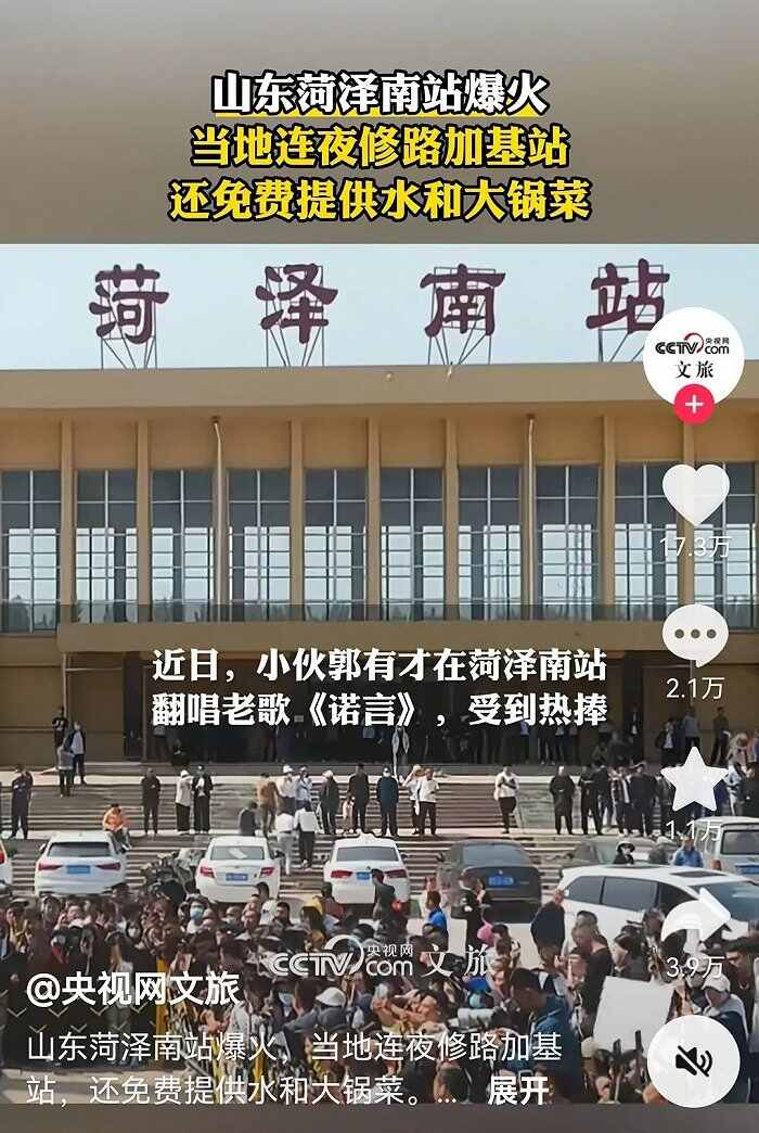 在5月17日之前,菏泽南站广场每天都会涌入超过40万人次的游客来听郭有才唱歌。为了迎接全国各地蜂拥而至的“客人”,菏泽火速反应,直接把沥青车开到了菏泽南站,火速修缮路面,点亮站房上的站名灯牌,保障大家的出行体验。