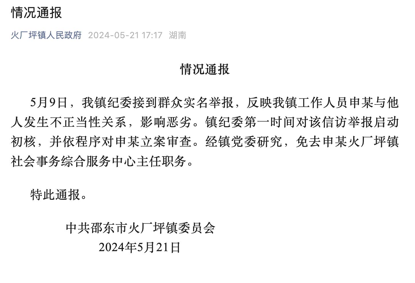 5月21日,中共邵东市火厂坪镇委员会发布一则情况通报,原文如下。