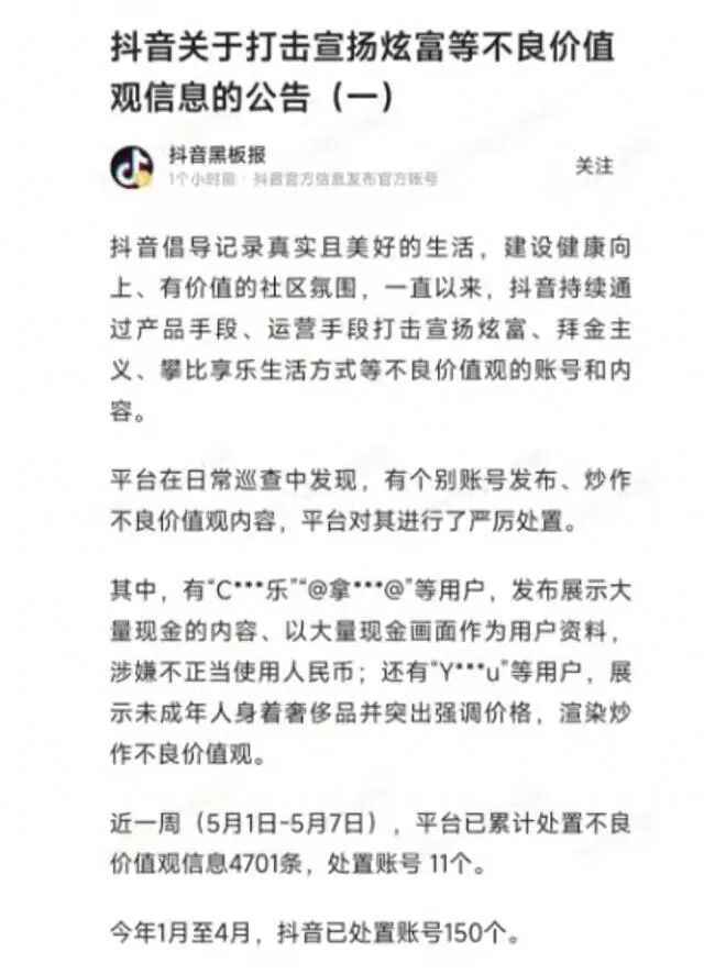 5月15日,腾讯、抖音、快手、微博、b站、小红书等平台发布不良价值导向内容专项治理公告,针对近期网络上出现的“奢靡浪费”“炫富拜金”等问题,各平台从严打击,倡导理性、文明的消费观和价值观。