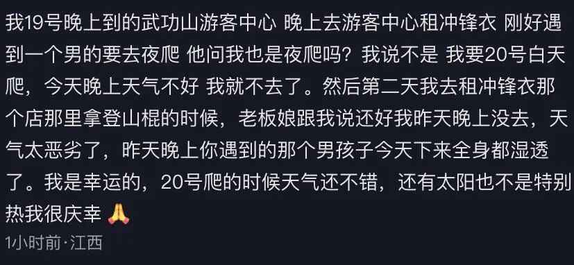 据媒体报道,此前多次“反穿”武功山的廖先生表示,想要“反穿”成功需要好天气,而实际情况是,武功山天气多变,山顶风速可达七八级,随时可能出现大雾、大雨等情况,能见度有时不足5米。