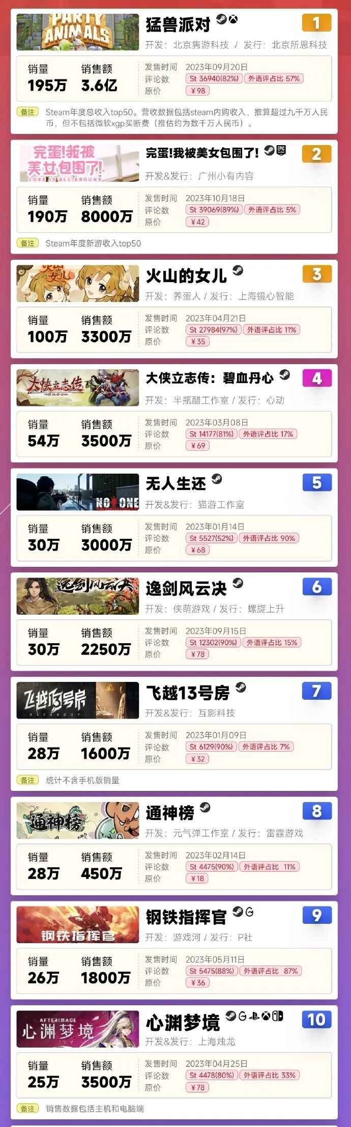 头部方面,2023年新发售的国产买断制游戏中,销量前20名的游戏无一款定价百元以上,其中半数定价低于50元。