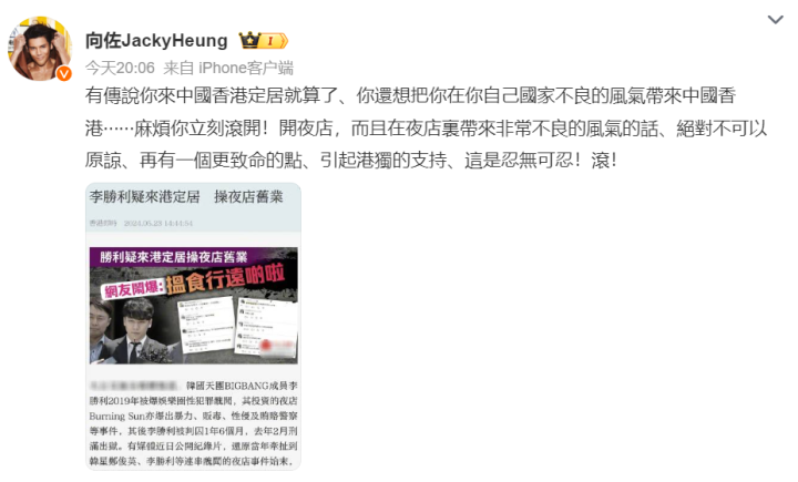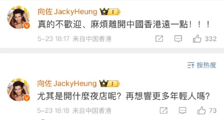5月23日,香港男星向佐对此怒斥:“真的不欢迎,麻烦离中国香港远一点!”