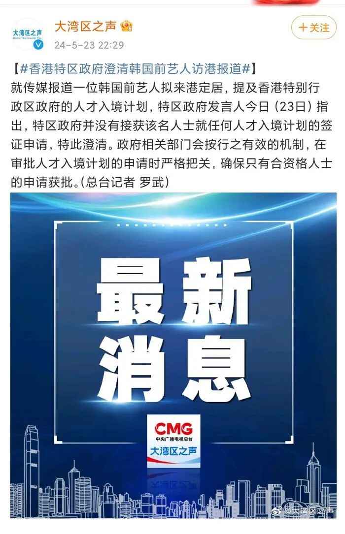 据@大湾区之声,就传媒报道一位韩国前艺人拟来港定居,提及香港特别行政区政府的人才入境计划,特区政府发言人今日(23日)指出,特区政府并没有接获该名人士就任何人才入境计划的签证申请,特此澄清。政府相关部门会按行之有效的机制,在审批人才入境计划的申请时严格把关,确保只有合资格人士的申请获批。