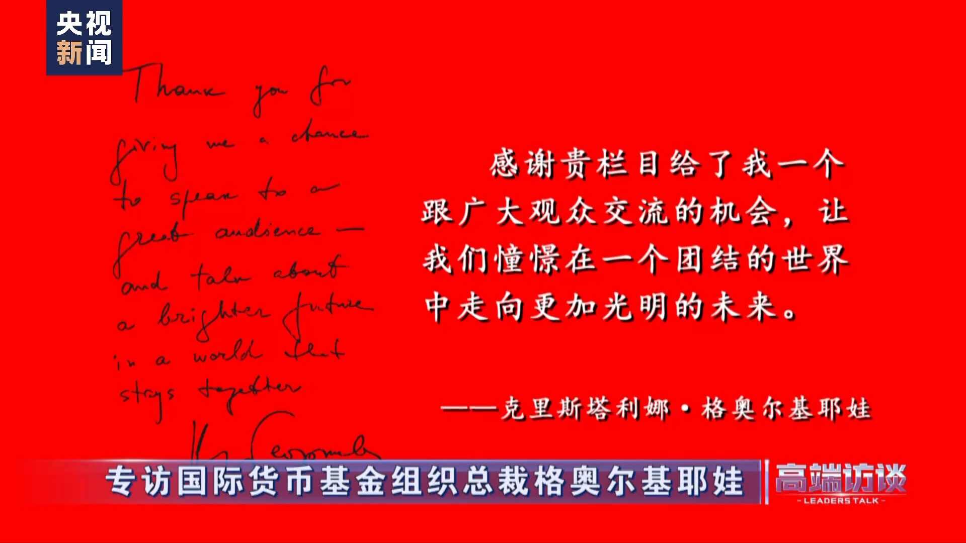 国际货币基金组织总裁格奥尔基耶娃在接受总台专访后题词:感谢贵栏目给了我一个跟广大观众交流的机会,让我们憧憬在一个团结的世界中走向更加光明的未来。