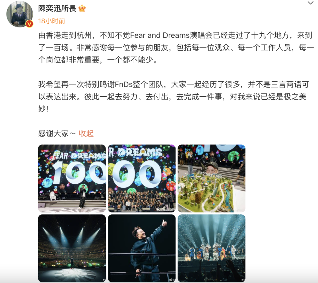 就在昨日,陈奕迅还在发文,感慨100场演唱会一路走来,大家共同经历:由香港走到杭州,不知不觉Fear and Dreams演唱会已经走过了十九个地方,来到了一百场。非常感谢每一位参与的朋友,包括每一位观众、每一个工作人员,每一个岗位都非常重要,一个都不能少。