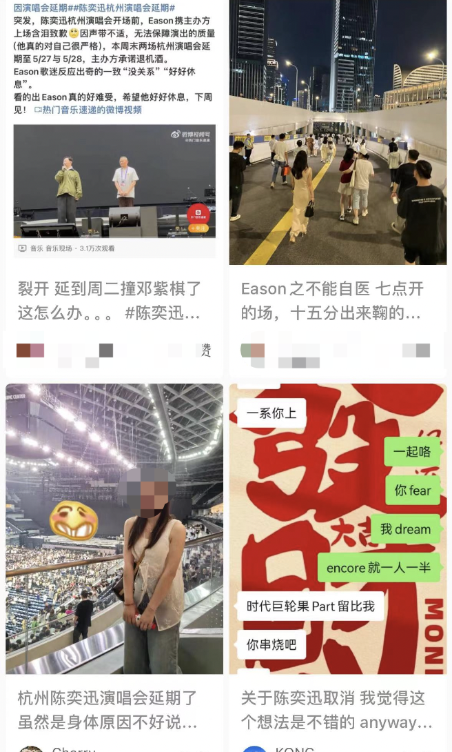 5月25日,歌手陈奕迅在自己的杭州演唱会上宣布,因自己声带不适无法保障演出质量,本周末两场演唱会将延期至5月27日、28日。他鞠躬含泪向歌迷致歉,主办方工作人员则承诺除了将为想退票的观众全额退款外,还会为外地赶来的观众赔付机酒费用。