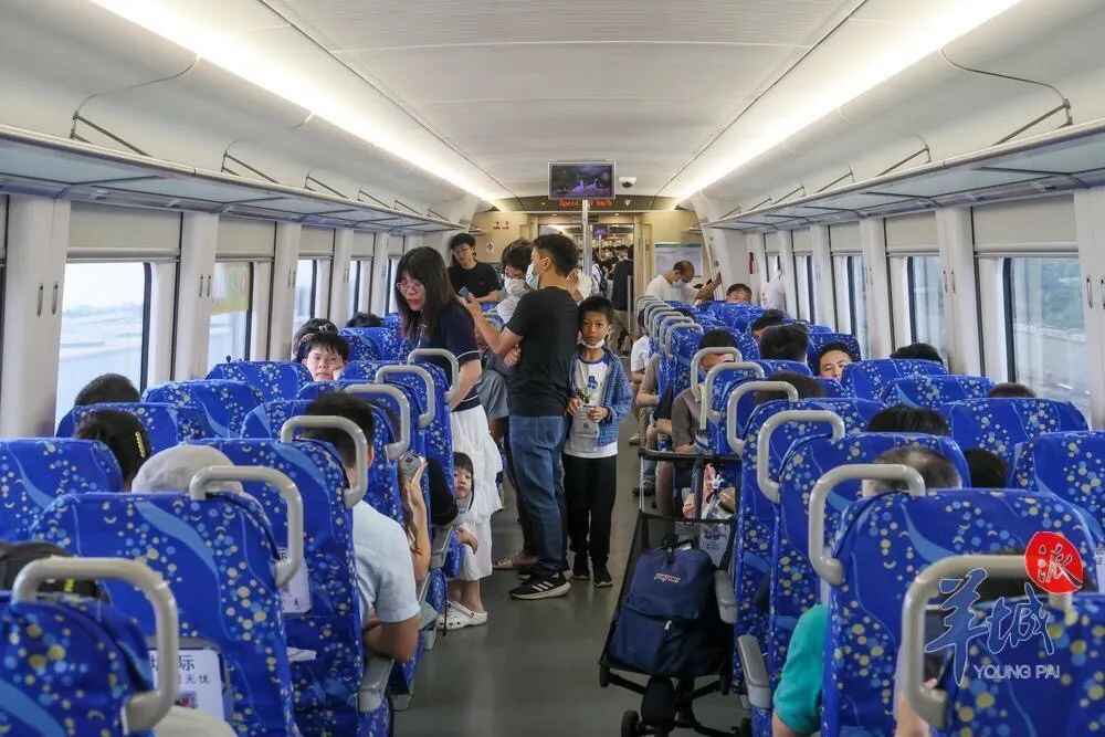 12时08分,佛莞城际(番禺—东莞西)首班车从番禺站正式发车,车厢内满是打卡体验的乘客。适逢周末,不少家长带着孩子搭城际、游景点。
