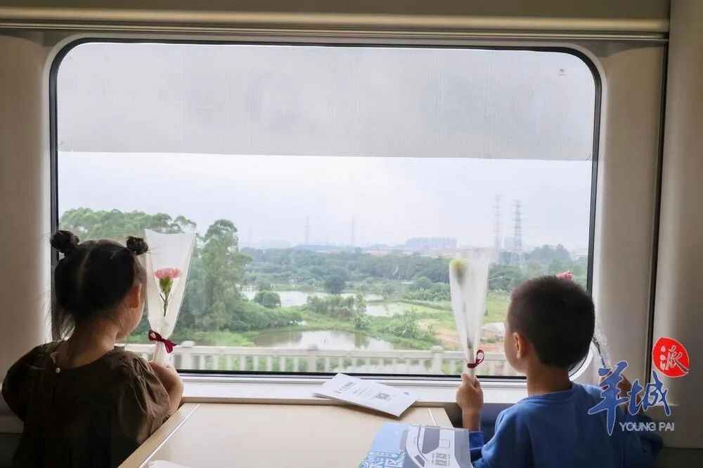 小朋友们乘坐佛莞城际(番禺—东莞西)首班车,欣赏窗外风景。