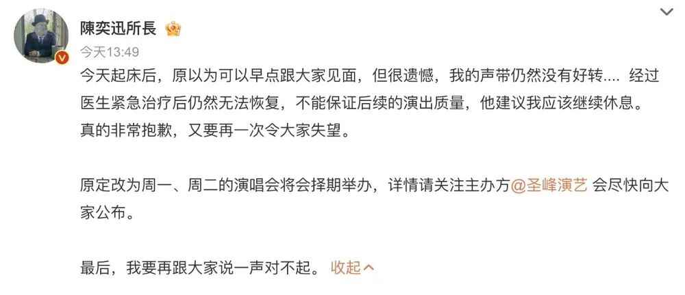 “今天起床后,原以为可以早点跟大家见面,但很遗憾,我的声带仍然没有好转.... 经过医生紧急治疗后仍然无法恢复,不能保证后续的演出质量,他建议我应该继续休息。真的非常抱歉,又要再一次令大家失望。