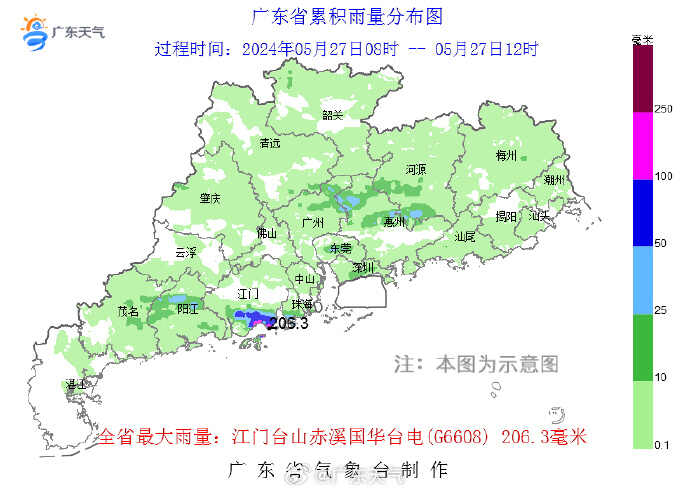 监测显示,27日8时到27日12时,广东省最大雨量出现在江门台山市赤溪镇,显示达206.3毫米。