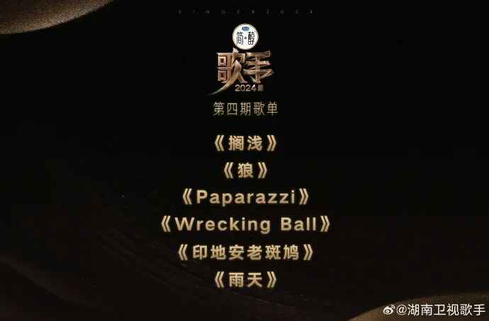 今日,《歌手2024》第四期竞演歌单新鲜出炉,分别为《搁浅》《狼》《Paparazzi》《Wrecking Ball》《印第安老斑鸠》《雨天》。其中《搁浅》《印第安老斑鸠》两首都是周杰伦的歌。