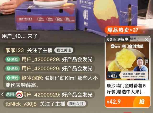 这一场持续4.5个小时的直播,最终交易额如何?直播间显示为“爆品”的“全家福雪糕丝绒可可巴旦木草莓白巧半半巧巧”累计销售100+,“康沙鸣门金时番薯5斤装【精选中大果】海南沙地种植新鲜板栗地瓜”累计销售200+。