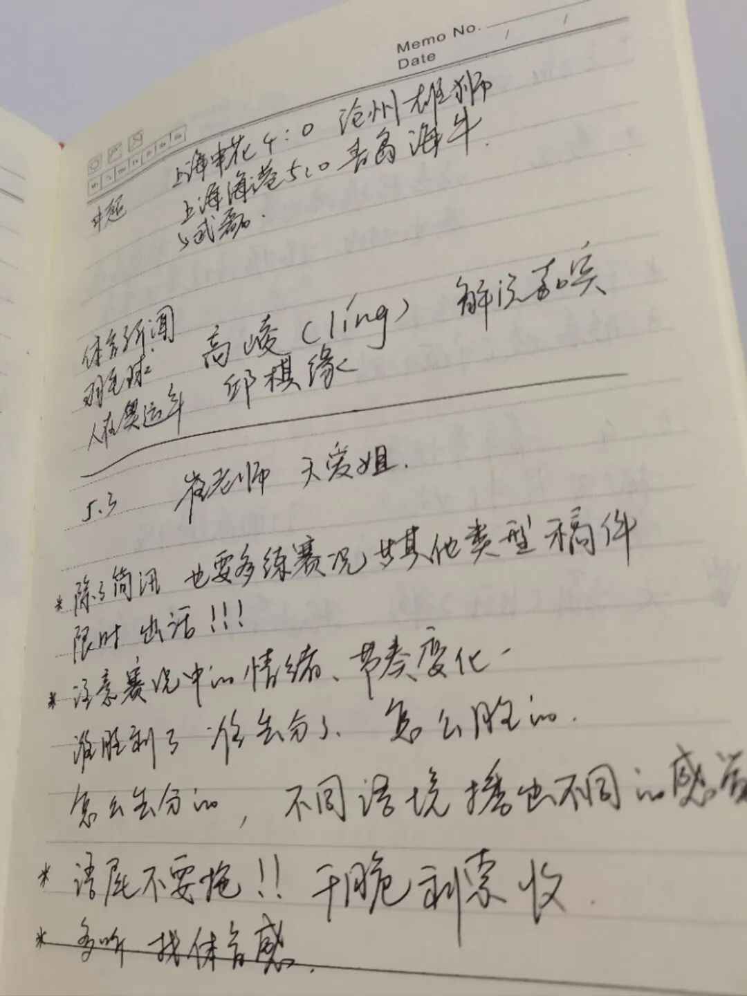 更多的工作安排也在“提质增效”中。播报排班从一组一天升级到一组两天、三天,未来可能还会延长至一周,强化播报记忆和状态,其间还要穿插配音班,以便提前适应大赛期间身兼数职的工作节奏。栏目组还考虑,让他们接触一些后期剪辑、出镜采访等业务,掌握体育播报的方方面面。此外,用体育知识来充实头脑,也是同学们的每日必学(附笔记一页)。