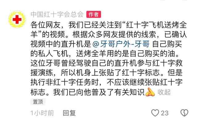 30日上午,中国红十字会总会也在官方抖音账号评论区内进行了回复:各位网友,我们已经关注到“红十字飞机送烤全羊”的视频。根据众多网友提供的线索,已确认视频中的直升机是@牙哥户外-牙哥 自己购买的私人飞机,送烤全羊用的是自己购买的油。这位牙哥曾经驾驶自己的直升机参与红十字救援演练,所以机身上张贴了红十字标志。但是执行非红十字任务时,不应该继续张贴红十字会标志。我们已向他普及了有关知识。